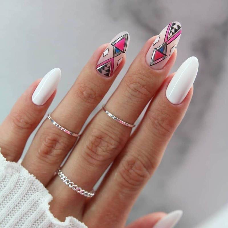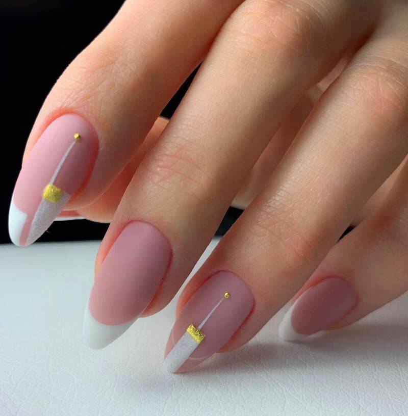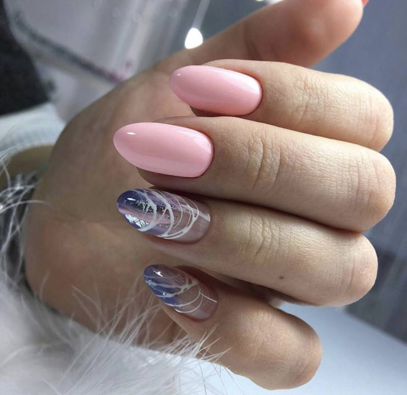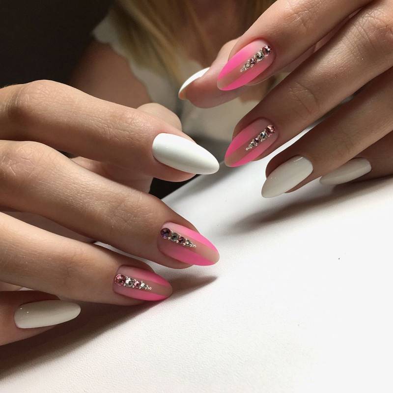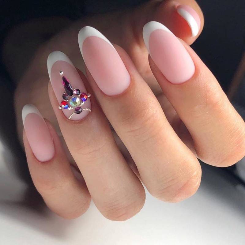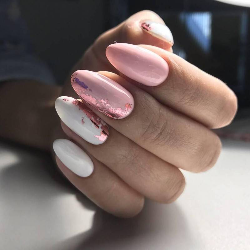 - бело-розовый миндальный маникюр, а один ноготок полностью белый;