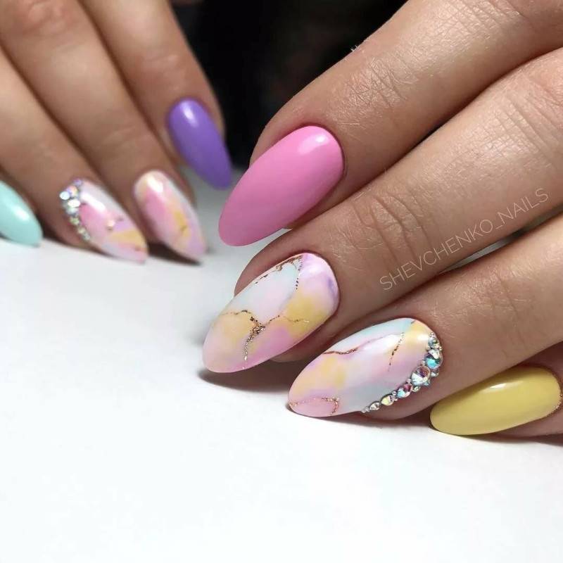 Разноцветный маникюр — самый простой способ дизайна на миндалевидные ногти в 2023 году. Сочетание цветов разноцветного маникюра можно подобрать по разным критериям:
