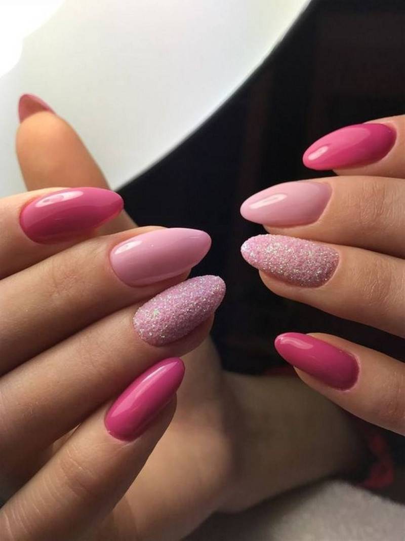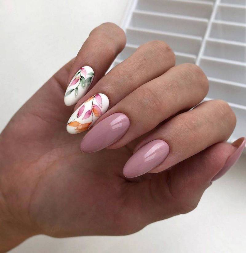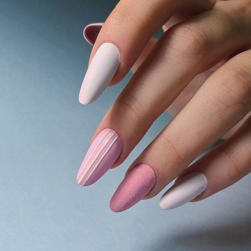 Контраст и эффектность является символом миндального дизайна маникюра на разных руках. Выбор нескольких оттенков или цветов дает возможность разнообразия, не выходящего за рамки будней.