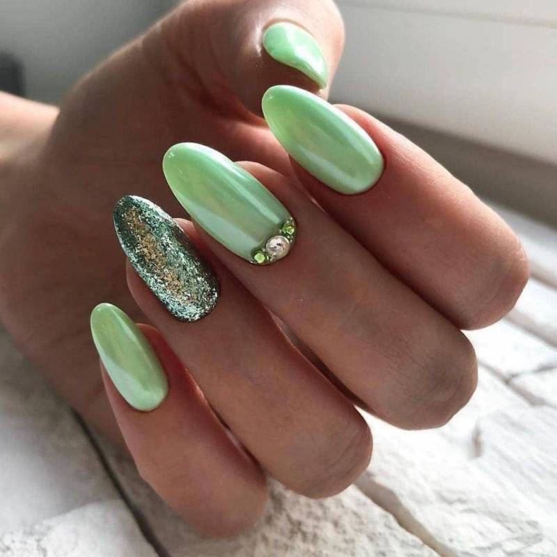 Стразы и бусины часто используют только для акцента. Поэтому в основном такой маникюр получается не слишком ярким. В некоторых случаях из них выкладывают целую цветочную композицию на одном или двух ноготках. Конечно же, оформление будет намного более заметным. Его выбирают для вечерних мероприятий в качестве украшения образа. Что касается блесток, то они тоже могут выглядеть совершенно по-разному. Кто-то предпочитает россыпь, другие же любят интенсивное нанесение.