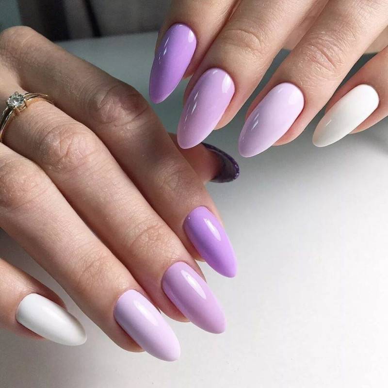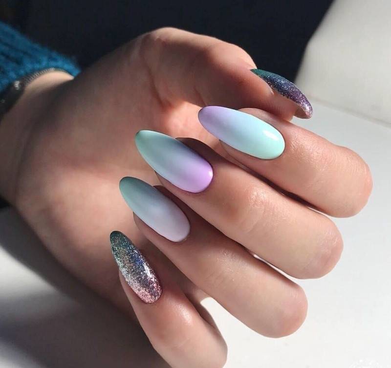 Радужная расцветка на миндалевидных ногтях задействует все цвета, которые плавно перетекают друг в друга. Неброско и стильно выглядит в пастельном исполнении.