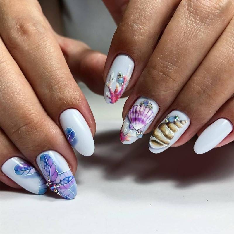 Миндальная форма ногтей является самой универсальной для летнего сезона. Разнообразные виды дизайна, оттенки и декор — все это прекрасно смотрится на таком маникюре. В подборке идей вы найдете множество вариантов оформления на любой вкус.