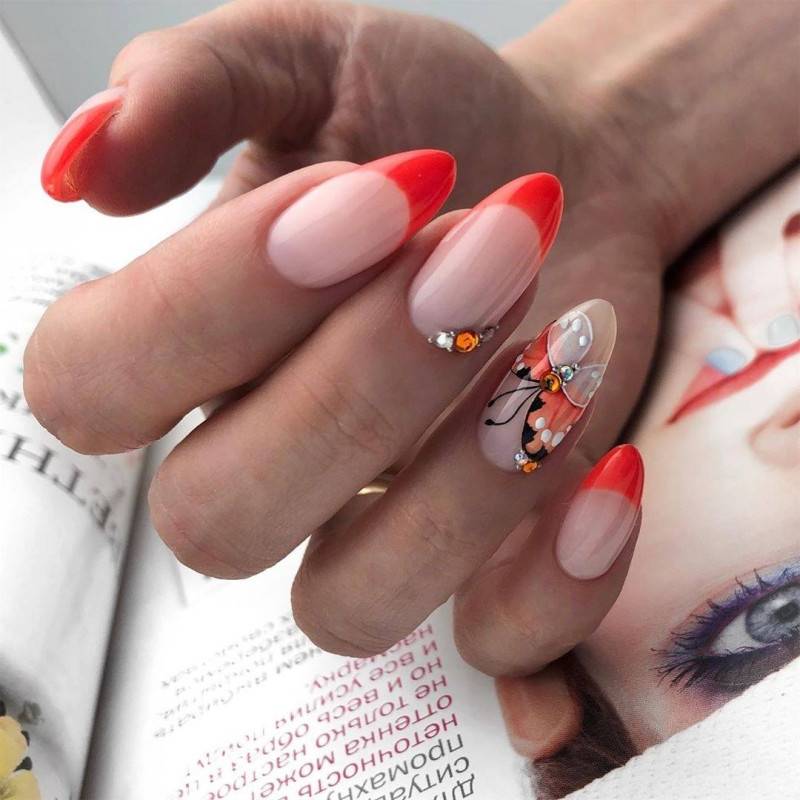 И все же мастера нейл-арта оставляют в приоритете сочетания красного и нюдового (либо розового лаков). При этом можно встретить маникюр миндаль в технике френч, выполненный следующим образом: все ноготки раскрашены прозрачным и красным лаками, один содержит рисунок на нюдовом фоне, например, горизонтальные полоски, 3 горошинки, или треугольник из страз.