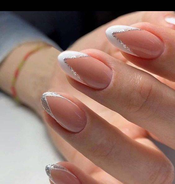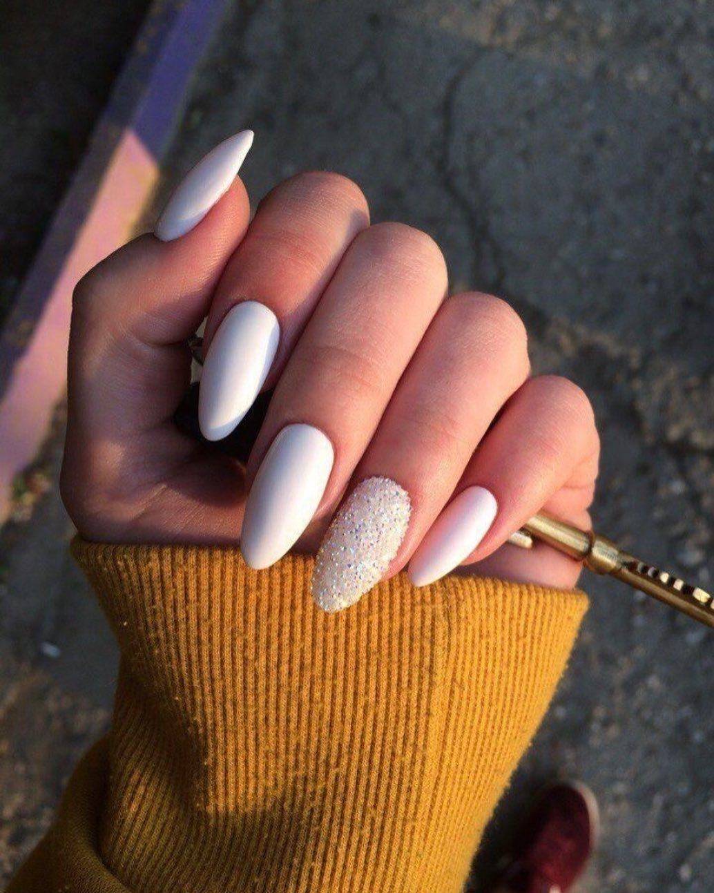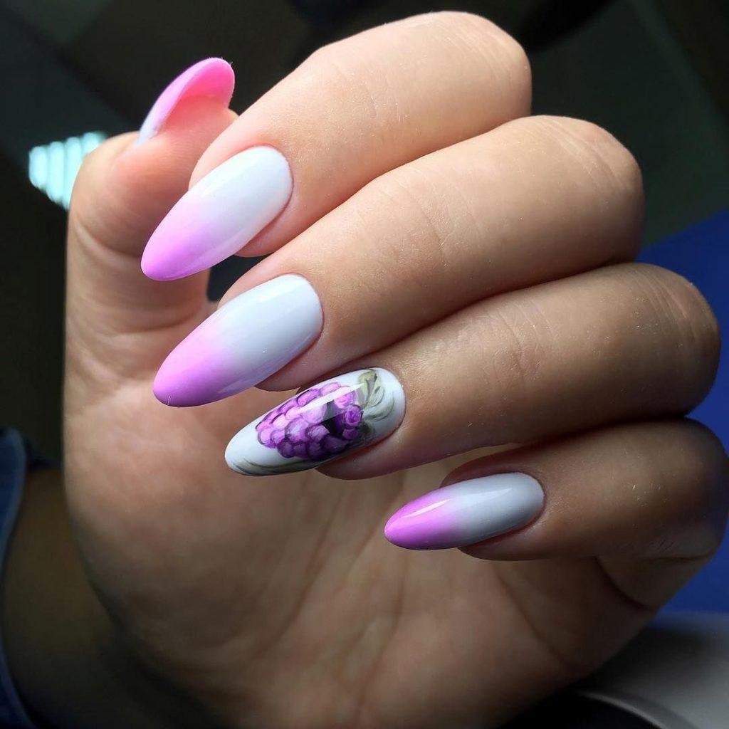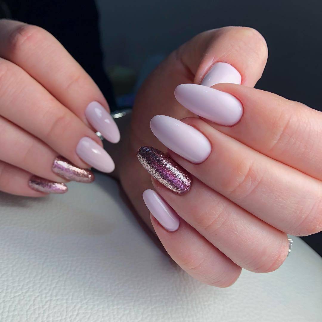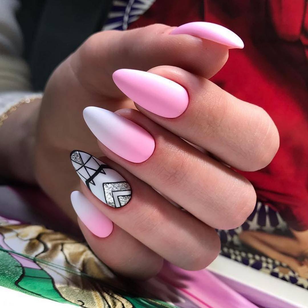 - бело-розовый миндальный маникюр, а один ноготок полностью белый;