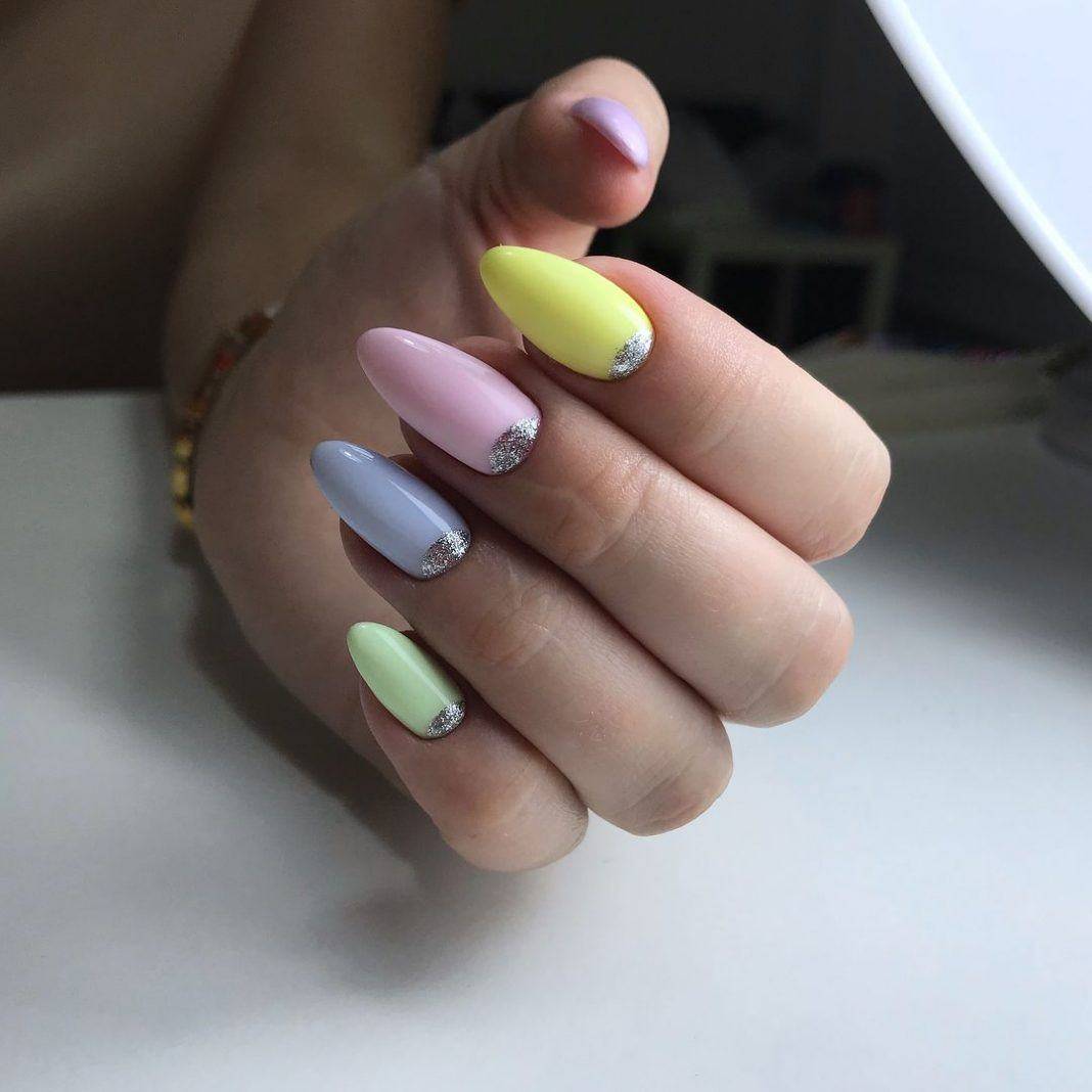 Разноцветный маникюр — самый простой способ дизайна на миндалевидные ногти в 2023 году. Сочетание цветов разноцветного маникюра можно подобрать по разным критериям: