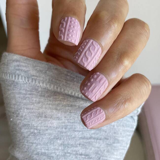 Этот простой розовый маникюр с “вязкой” напоминает о мягком и теплом свитере. Вязаный рельеф на каждом ногте выглядит насыщенно и элегантно, делая его идеальным выбором для повседневного лука.