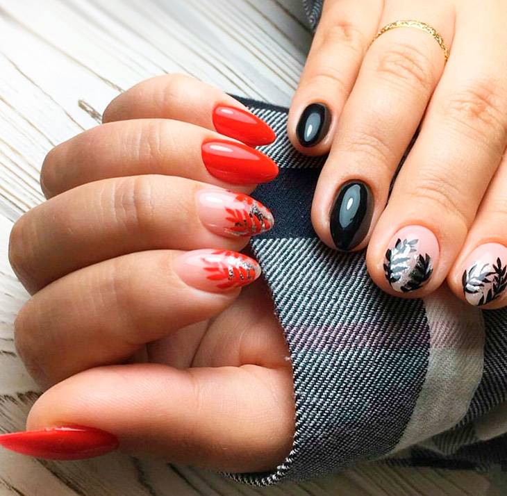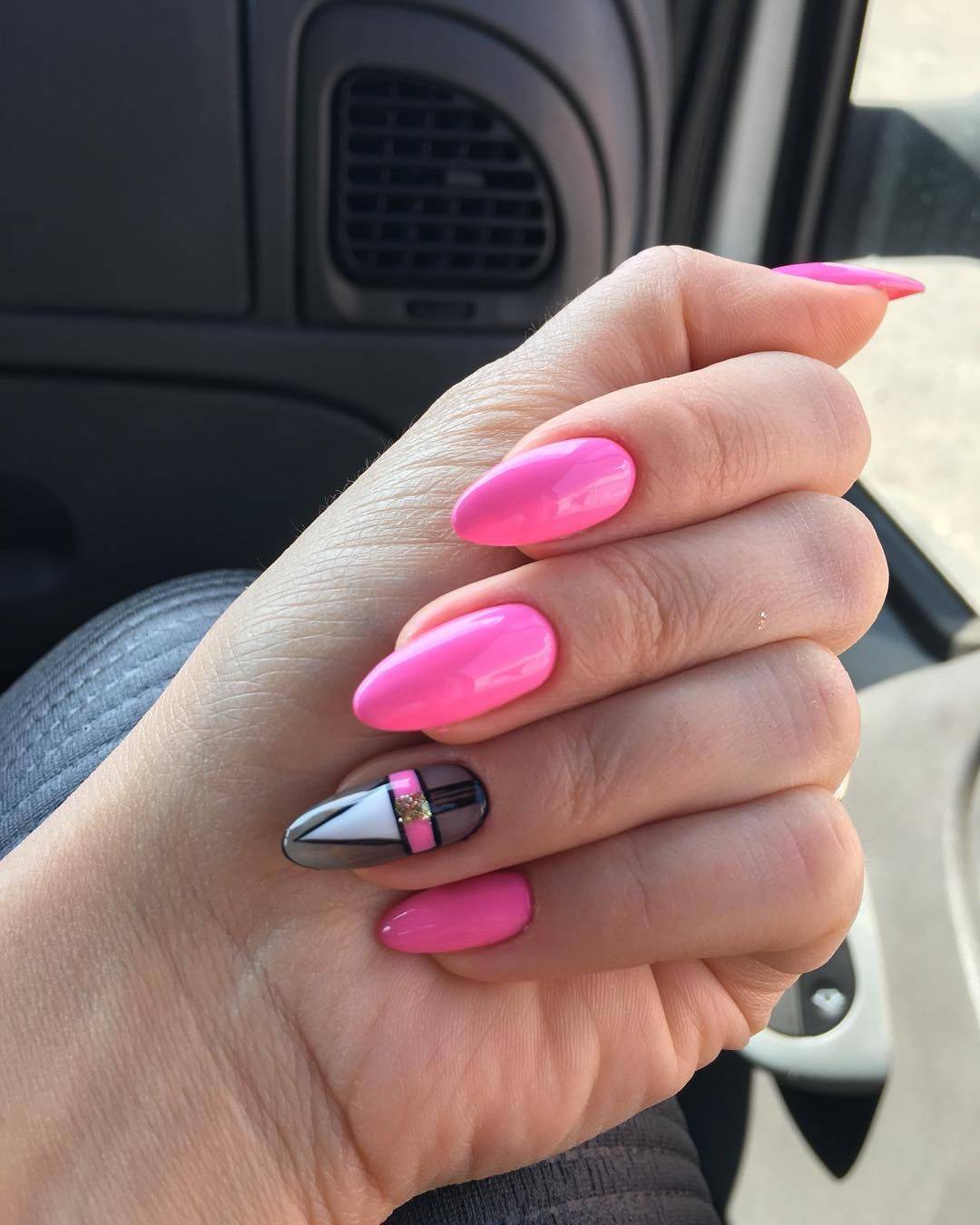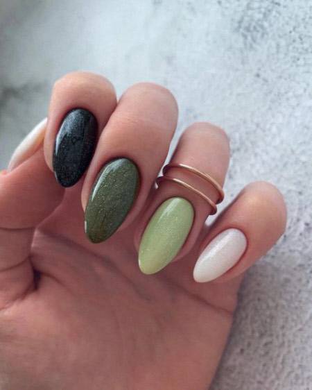 Контраст и эффектность является символом миндального дизайна маникюра на разных руках. Выбор нескольких оттенков или цветов дает возможность разнообразия, не выходящего за рамки будней.