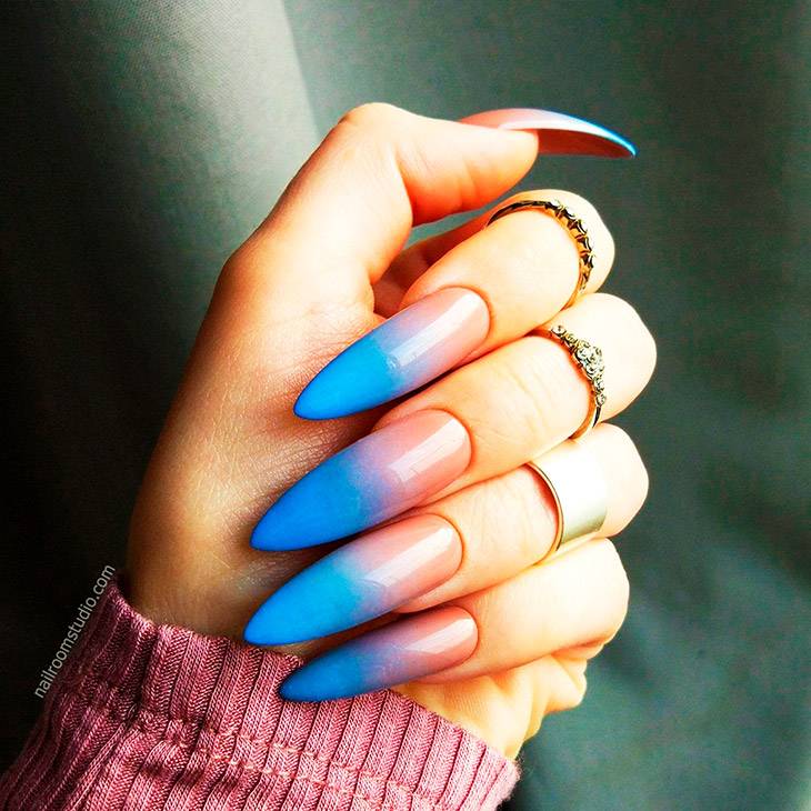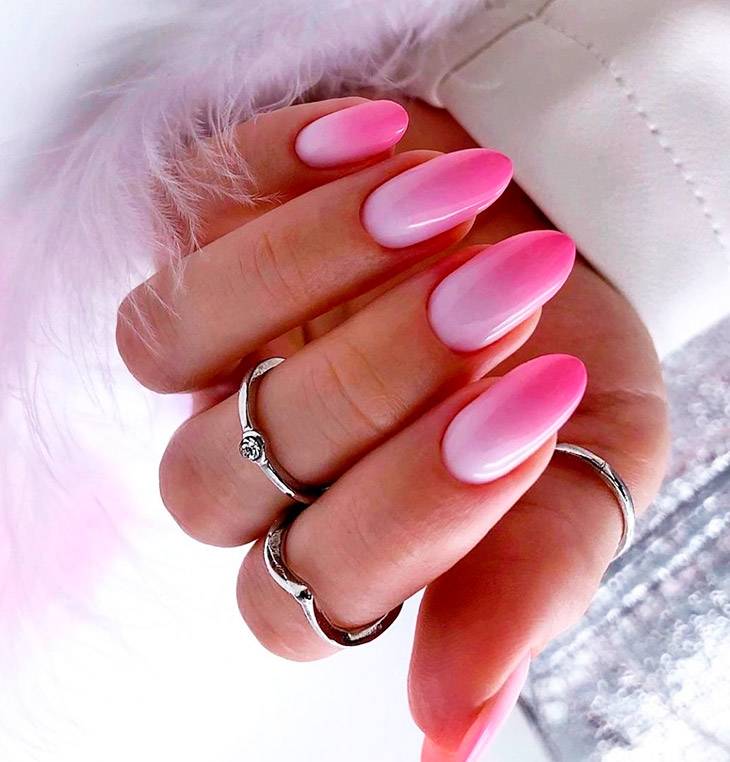 Радужная расцветка на миндалевидных ногтях задействует все цвета, которые плавно перетекают друг в друга. Неброско и стильно выглядит в пастельном исполнении.