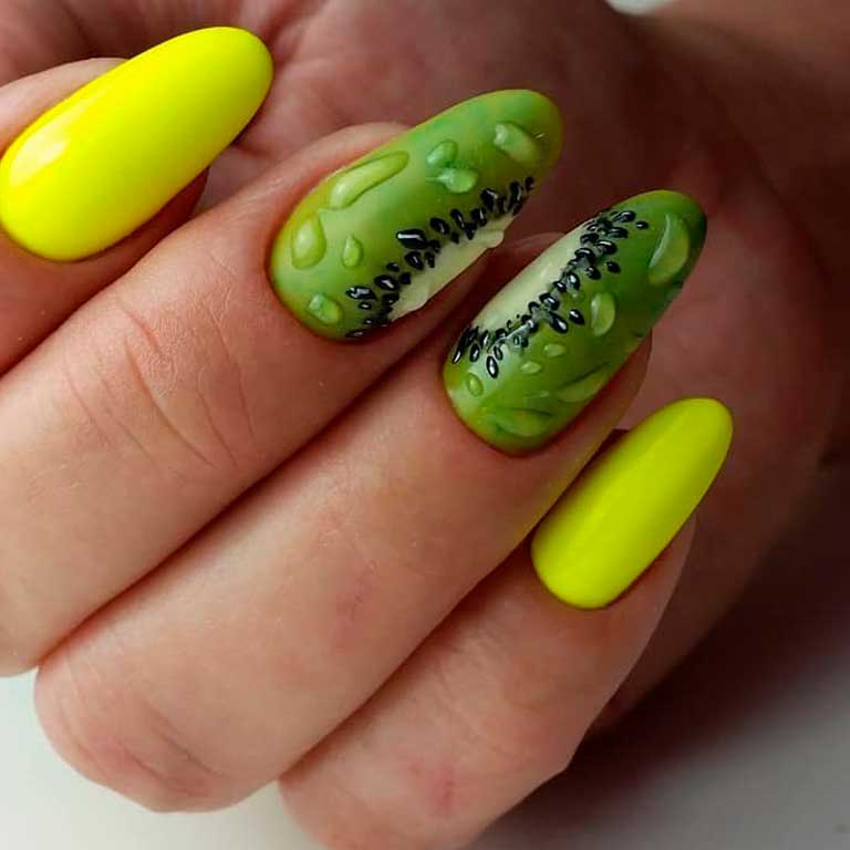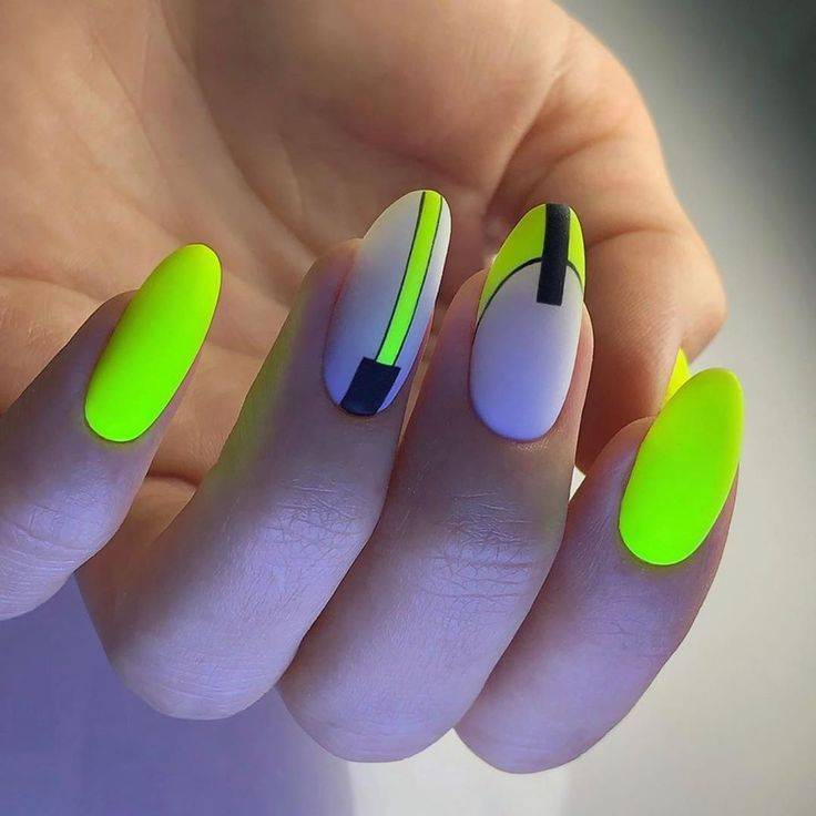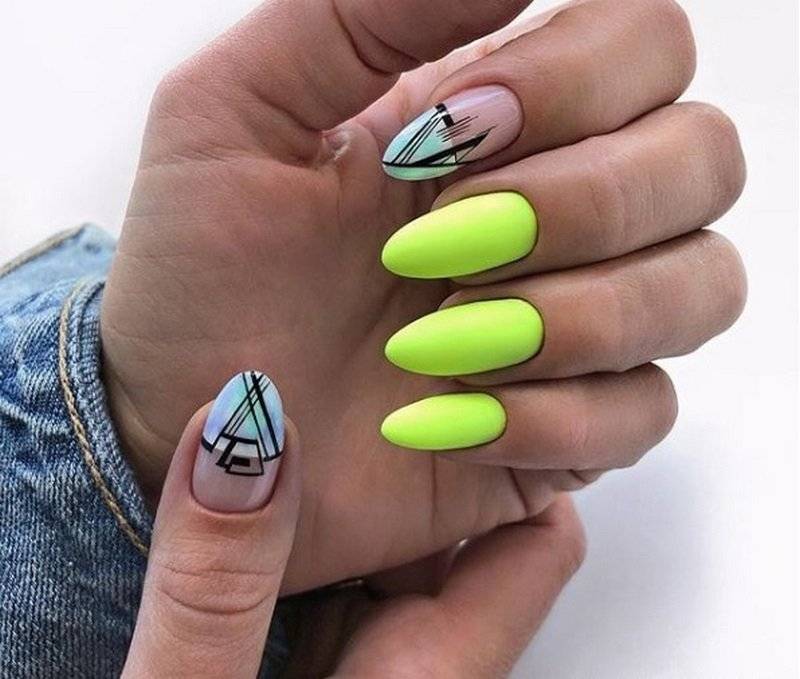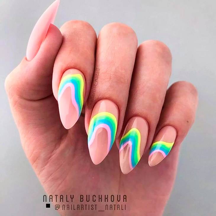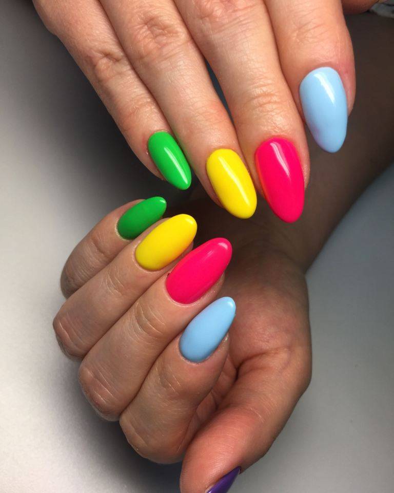 Броские, освежающие дизайны на миндальных ногтях с яркими красками