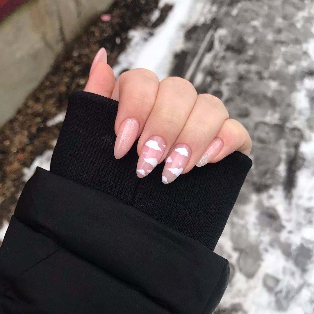 Размытые, полупрозрачные узоры смотрятся нежно и даже мило. Такой маникюр в 2024 году особенно хорошо подходит к миндальной форме, добавляет свежести. В основном на миндалевидной форме акварельные узоры делают в виде: