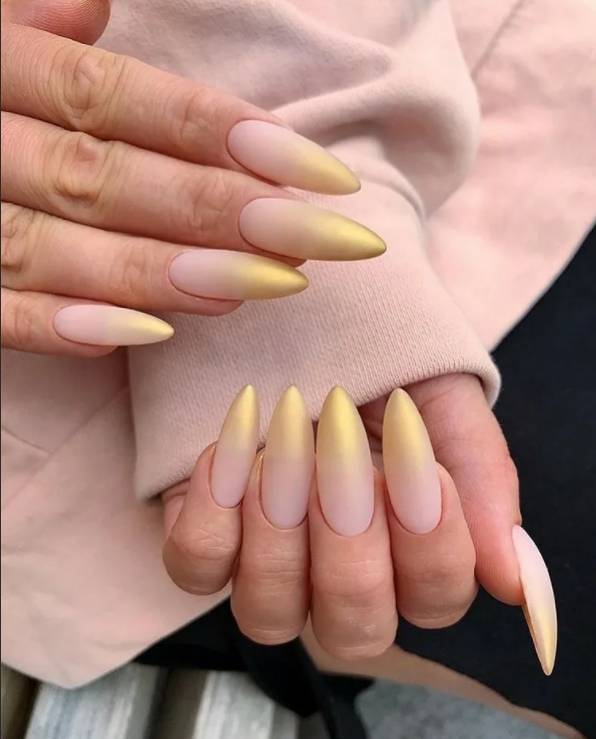 Этот дизайн миндальных ногтей в 2023 году популярен с глянцевым топом и с матовым.