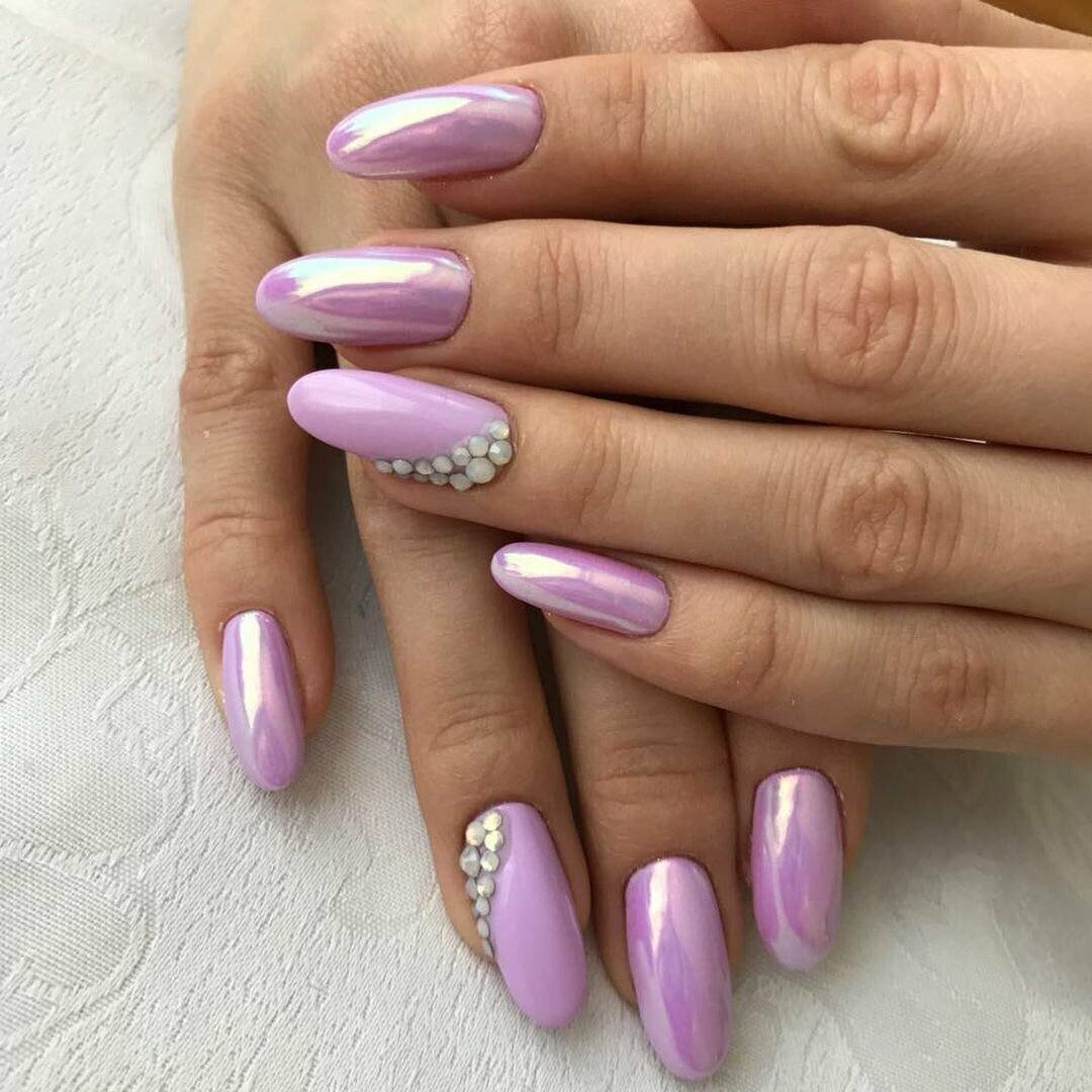 Для металлического маникюра можно применять в декоре клеящиеся полоски, лак с блестками, стразы, создавая дизайн в следующих техниках: