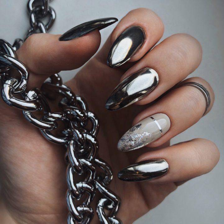 Металлик перешел к нам из прошлых годов популярного маникюра. Он превосходно ложиться на длинные ногти и заставляет их блестеть под светом солнца и лампы дома. В продаже есть масса разнообразных лаков или гель-лаков с металлическим отливом или втирка.