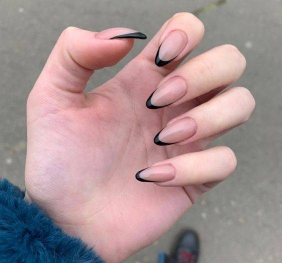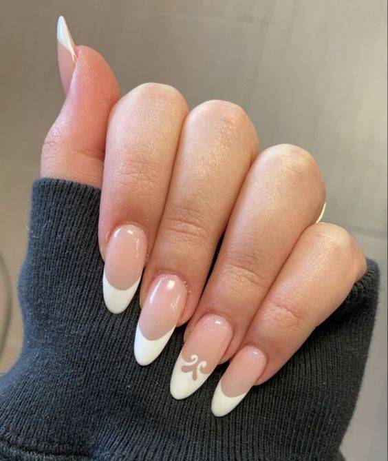 Французский маникюр на миндалевидных ногтях с дизайном и без