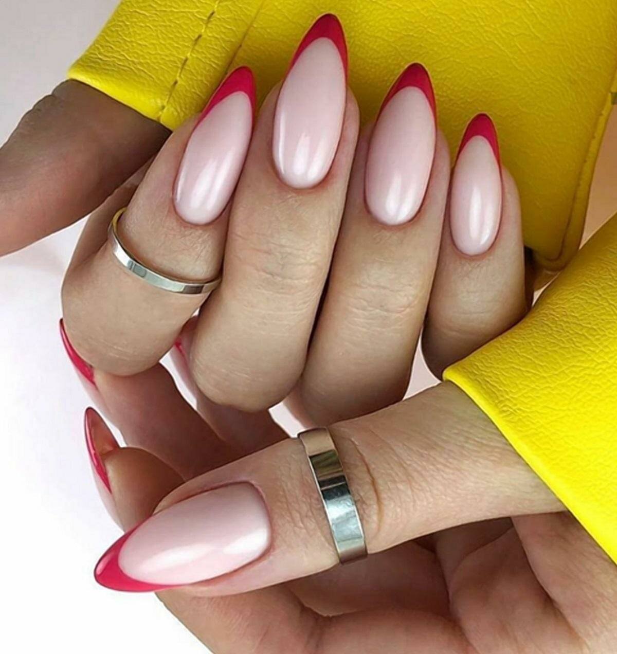 И все же мастера нейл-арта оставляют в приоритете сочетания красного и нюдового (либо розового лаков). При этом можно встретить маникюр миндаль в технике френч, выполненный следующим образом: все ноготки раскрашены прозрачным и красным лаками, один содержит рисунок на нюдовом фоне, например, горизонтальные полоски, 3 горошинки, или треугольник из страз.