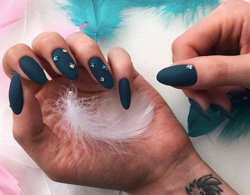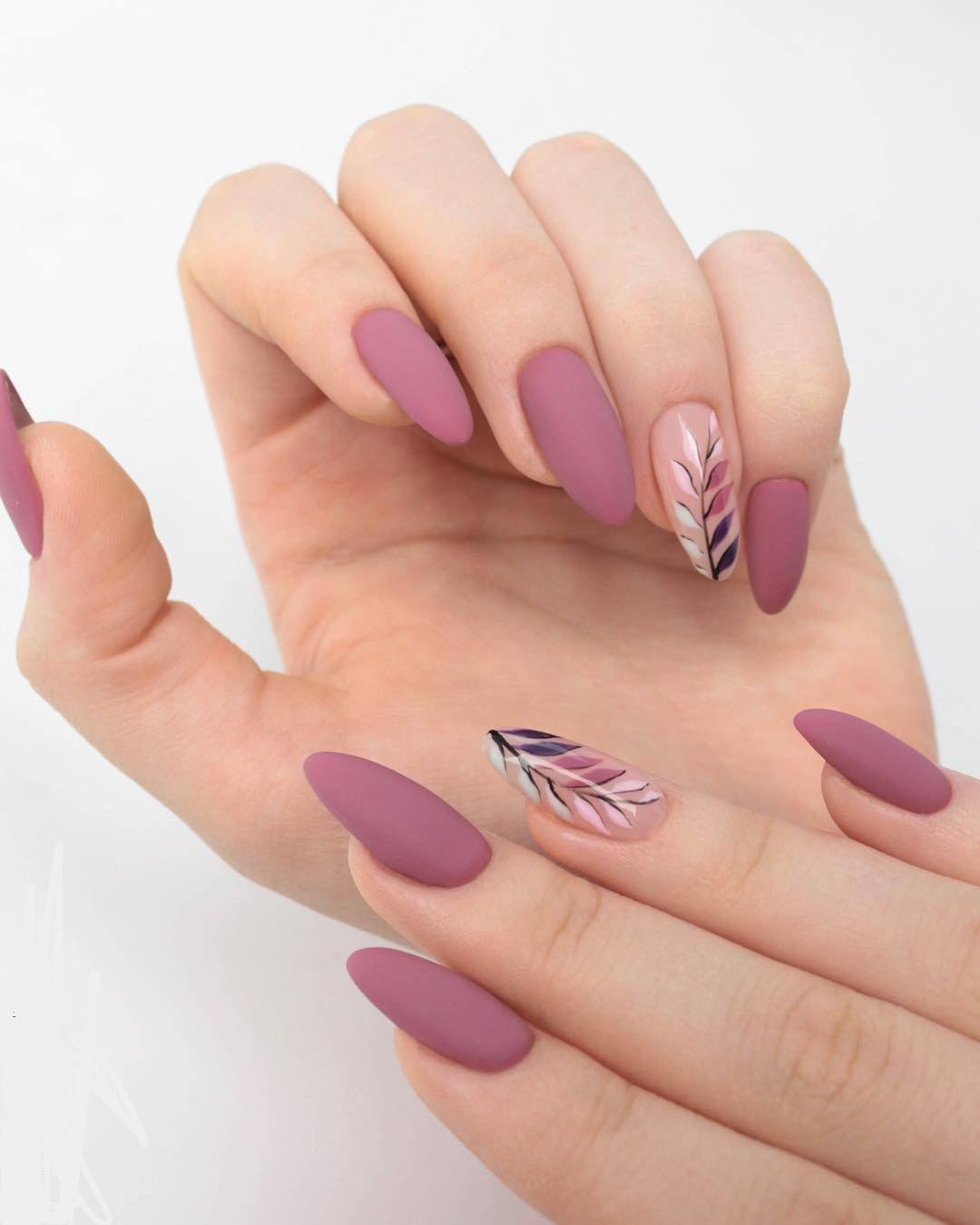 Среди всех новинок дизайна лидером будет матовый. Он очень эффектно выглядит на миндальном ногте, помогает образу приобрести изюминку и роскошь. Бархат отлично сочетается с остальными дизайнами, особенно с росписями и цветами.