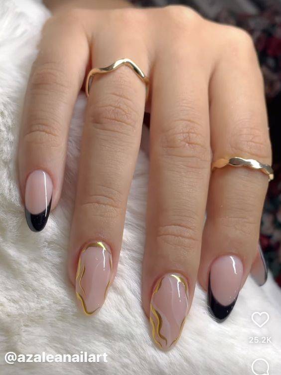 Очень популярен в наступающем сезоне маникюр в технике «вуаль», когда розовый ноготок словно покрыт нежной полупрозрачной черной вуалью. Пусть таким будут один ноготь, на остальные нанесите простой французский маникюр в двух цветах: черном и розовом.