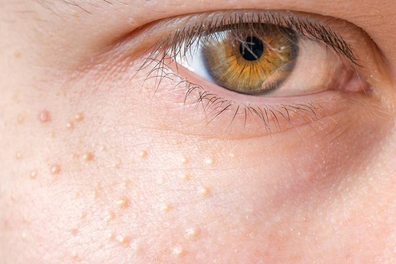 Являют собой плотные поверхностные кисты сальных желез. По внешнему виду напоминают мелкие белые зернышки. Их еще называют просянками. Такие узелки являются безболезненными, отсутствует воспалительный процесс. Внутри узелков содержится вязкий себум и кератин. Располагаются милиумы на носу, щеках, веках.
