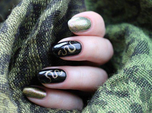 Интересный дизайн можно выполнить с помощью черного гель-лака. Его наносят на все ногти одной руки, а на второй черным цветом рисуют змею. В качестве фона для рисунка лучше использовать нюдовые оттенки или яркие, контрастирующие с черным покрытием цвета: желтый, красный, оранжевый. В зависимости от того, какой цвет будет выбран для ногтей с рисунком, можно получить либо спокойный маникюр для повседневной носки, либо яркий и эффектный дизайн.