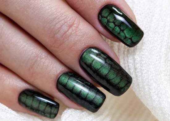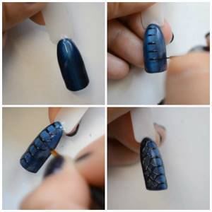 Есть один из самых простых способов создания дизайна ногтей с видом змеиной чешуи с помощью техники кракелюра. Для этого берут лак со специальным эффектом растрескивания и наносят на ногтевую пластину.