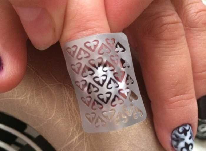 Поскольку сам трафарет плоский и жесткий, непосредственно с него перенести краску на ноготь не получится. Нужен