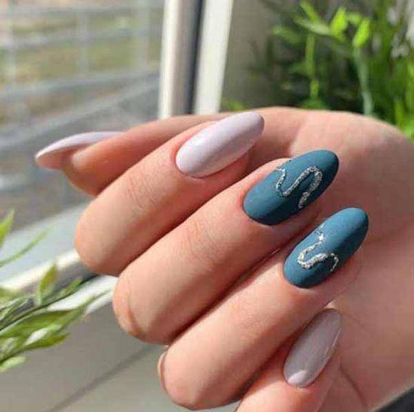 На светло-голубом фоне красиво смотрится змеиная чешуя синего цвета. Такой дизайн не будет слишком ярким и подойдет на каждый день. Светло-голубой маникюр можно дополнить рисунком змеиной кожи в белом цвете. Такой нейл-арт получится еще более нежным. Рисунок также можно создать в акварельной технике или нанести с помощью аэрографа.