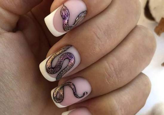 Нюдовый маникюр со змеей может стать отличным вариантом для повседневной носки. Для него используются полупрозрачные базы и нежные кремовые оттенки гель-лаков. Нейл-арт одинаково хорошо выглядит и на овальных, и на квадратных ноготках.