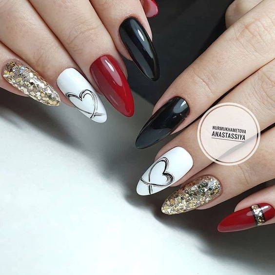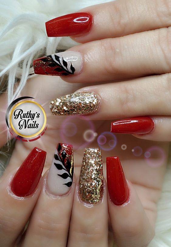 Красный цвет ногтей в сочетании с золотом – это классика жанра, которая никогда не выйдет из моды. Это сочетание придает образу сексуальности и элегантности.