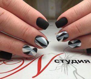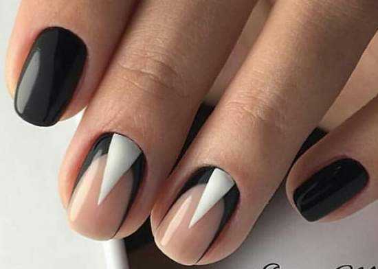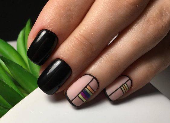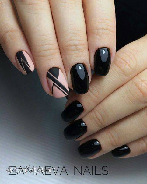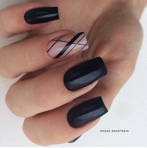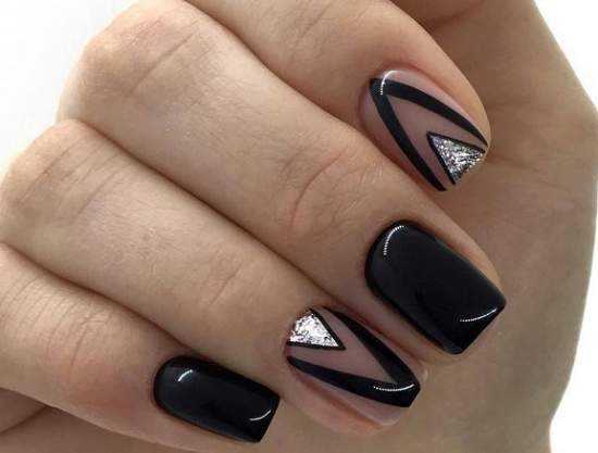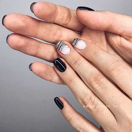 - чтобы маникюр выглядел сдержанней, в дополнении к черному используется прозрачное покрытие. Как вариант – нюдовое, белое закрашивание или пастельных тонов.