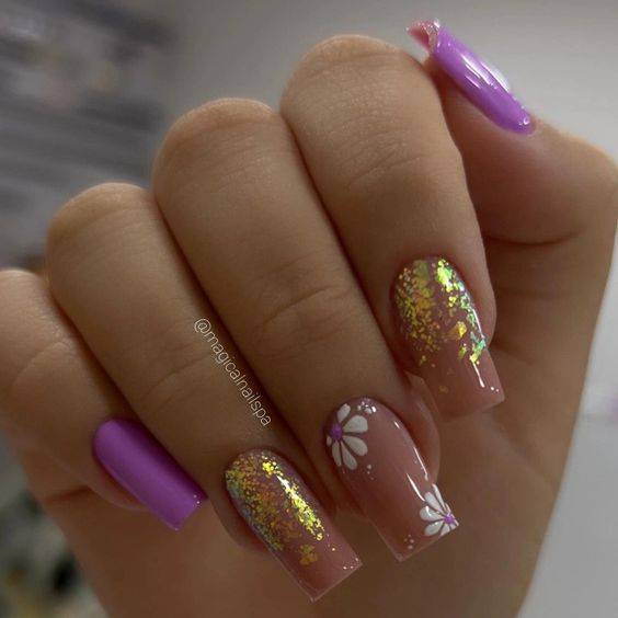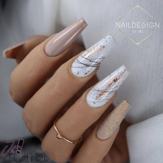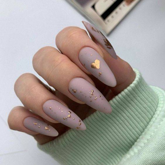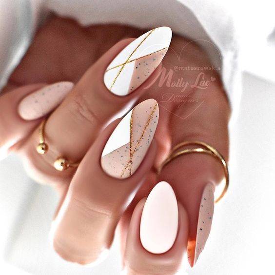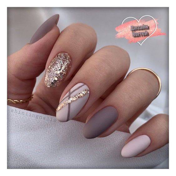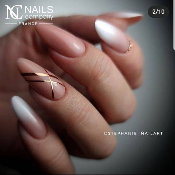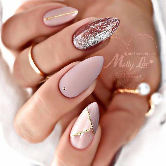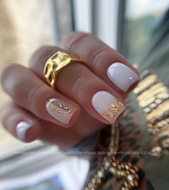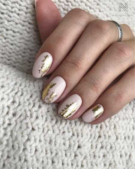 Нюдовые оттенки ногтей в сочетании с золотом создают нежный и женственный образ. Этот стиль идеально подойдет для повседневного использования.