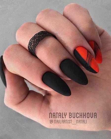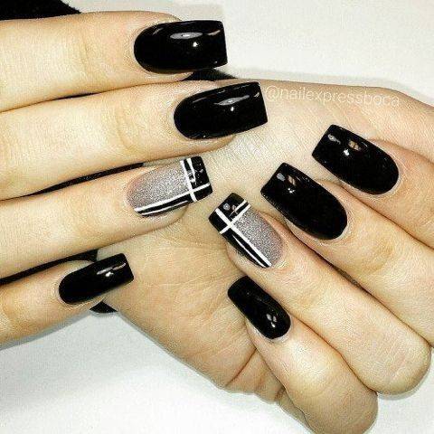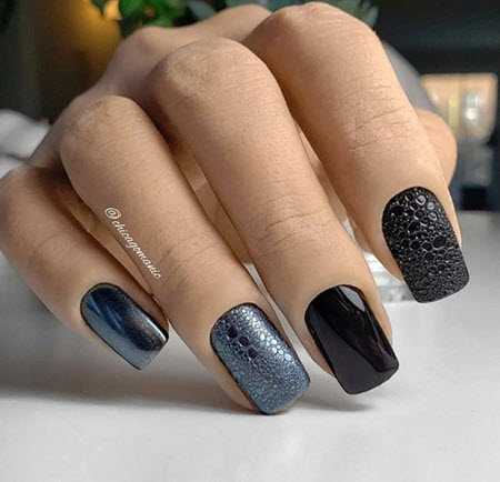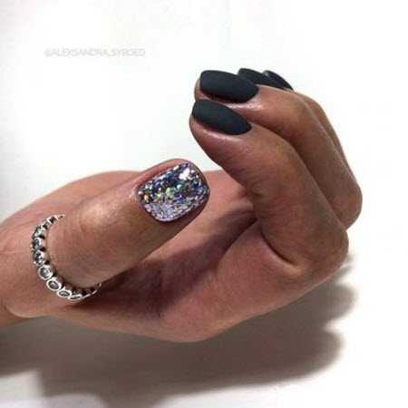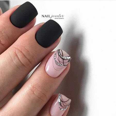 Классическое сочетание черного маникюра – серебристая и золотистая втирка. Но в зависимости от желаемого результата, могут выбираться и другие оттенки. Данный черный маникюр отлично подойдет в качестве вечернего, а если дополнить его дополнительным дизайном, то тематическим праздничным (к примеру, на Хэллоуин, Новый год).
