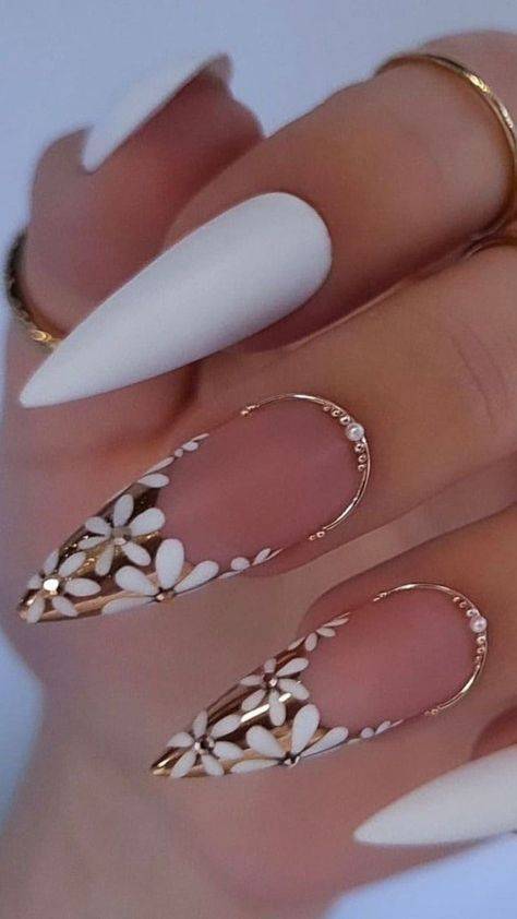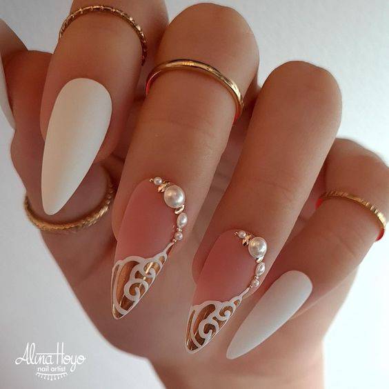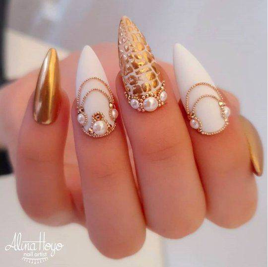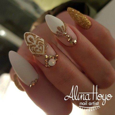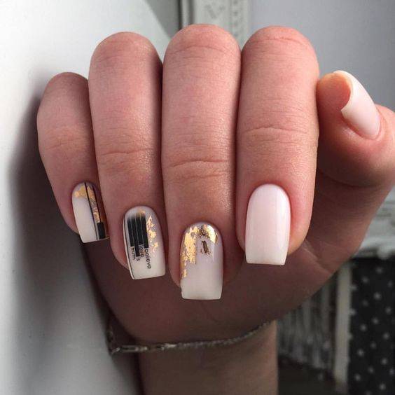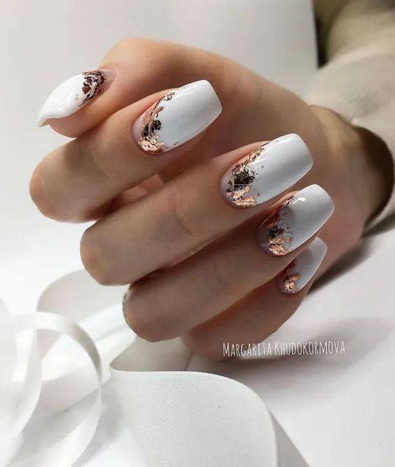 Белый цвет ногтей в сочетании с золотом выглядит очень изысканно и свежо. Это сочетание идеально подойдет для летнего периода, а также для создания свадебного образа.