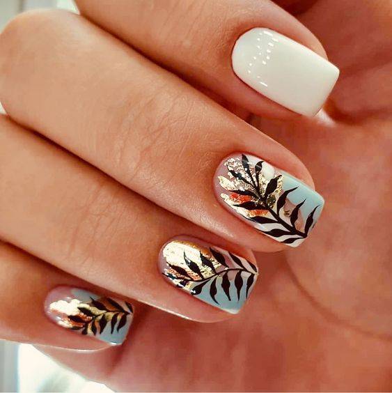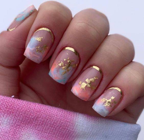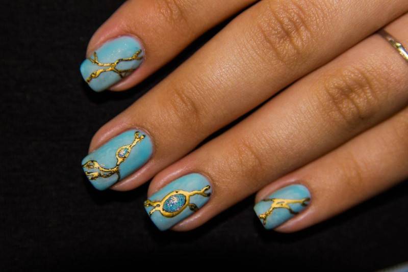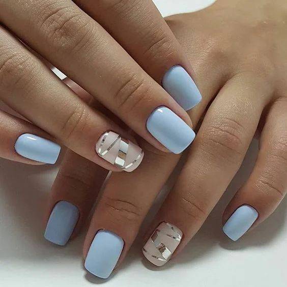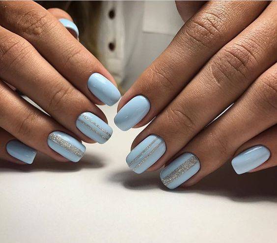 Голубые оттенки ногтей в сочетании с золотом – это очень нежное и изысканное сочетание. Оно идеально подойдет для создания романтичного и нежного образа.