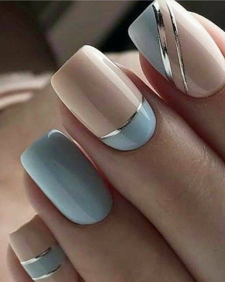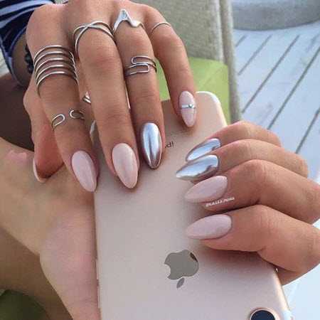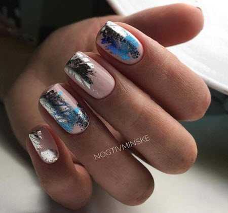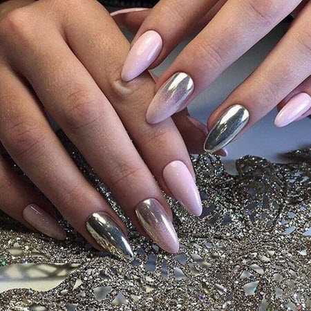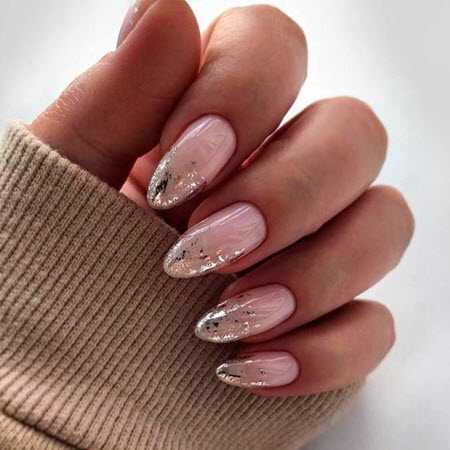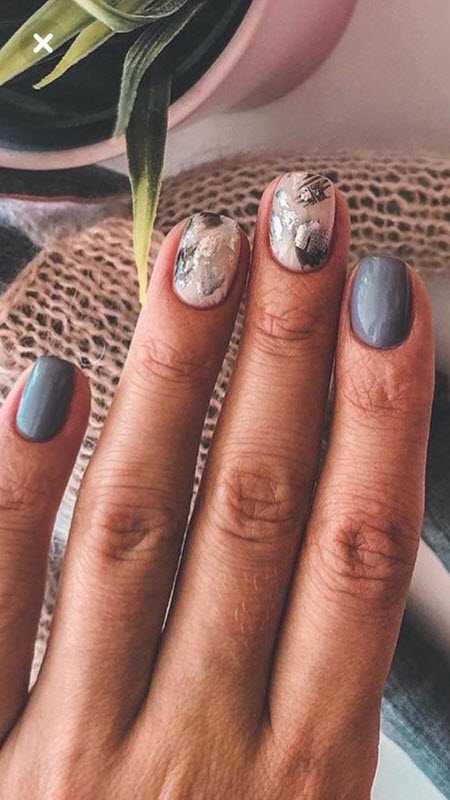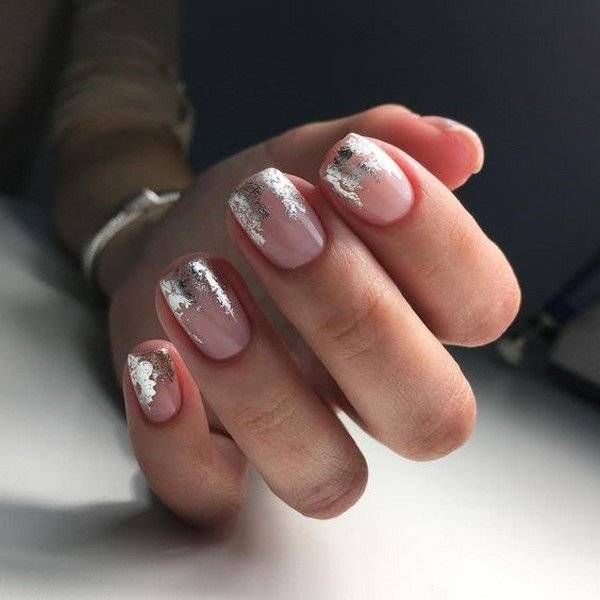 Далее рассмотрим маникюр с поталью в серебре, который тоже можно сделать себе в 2022 году. Он немного похож на предыдущий вариант, только фольга здесь на каждом ноготке расположена не так симметрично. В обоих случаях смотрится маникюр прекрасно.