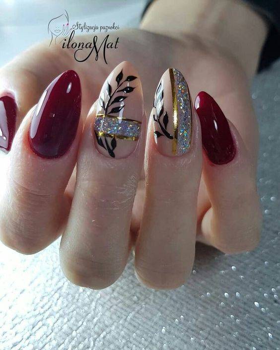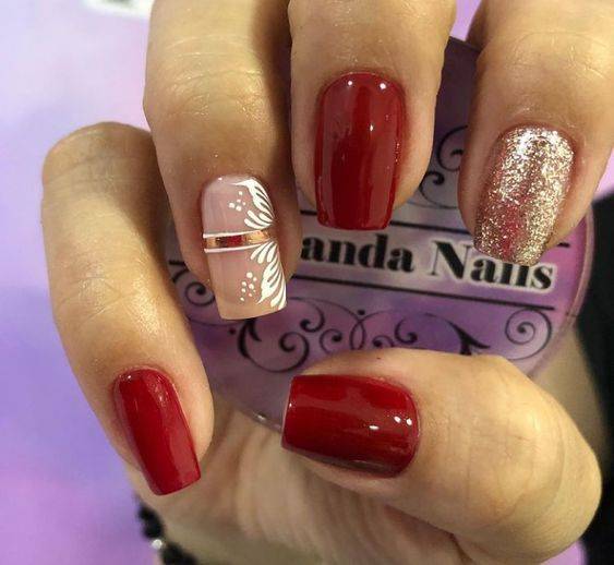 Алый, красный, вишневый – любой оттенок в сочетании с золотом выглядит по-настоящему роскошно. Все потому, что именно эти цвета ассоциируются со страстью и пылкими чувствами. В основном красные оттенки наносят на все ноготки, а лишь несколько из них украшают золотистыми вставками. Такое сочетание довольно яркое, но при этом не вызывающее. Поэтому этот маникюр модницы выбирают даже на каждый день. Также нередко красно-золотое сочетание оттенков применяют для создания тематического новогоднего оформления.