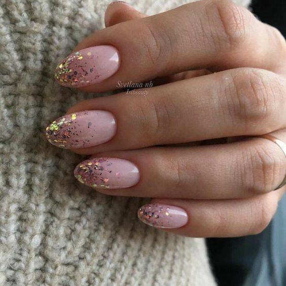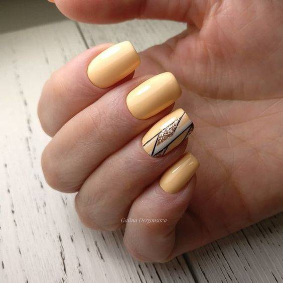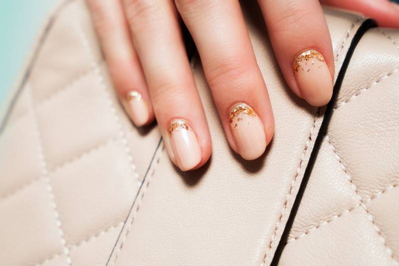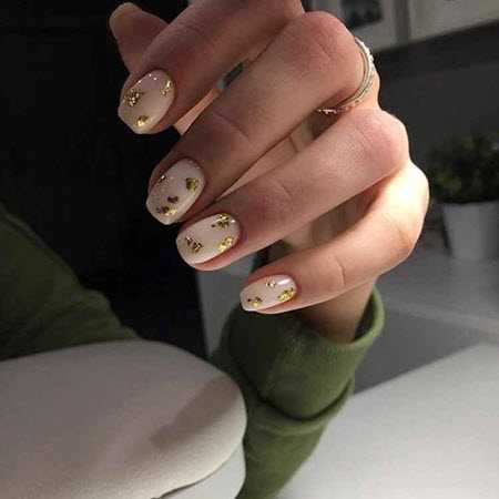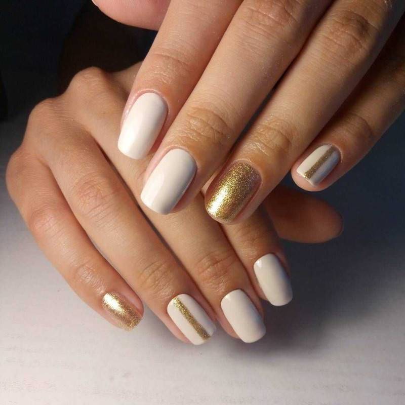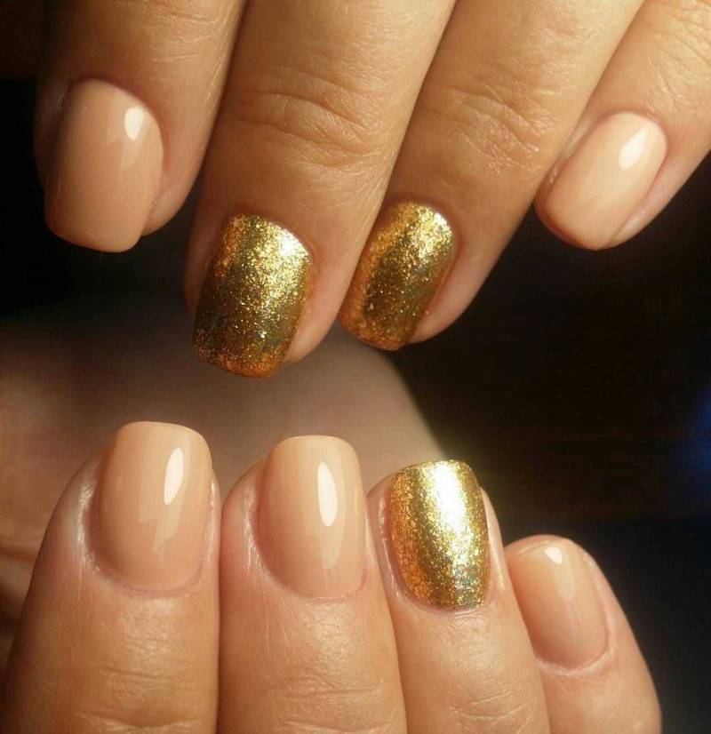 Любительницы лаконичного, нежного оформления чаще всего используют бежевый оттенок для основного покрытия. Кто-то считает такой маникюр слишком простым и скучным. В таком случае золотистые блестки будут идеальным украшением. Полоски, оттиски, геометрические детали или же полное покрытие – это лишь малая часть того, как именно можно оформить ноготки.