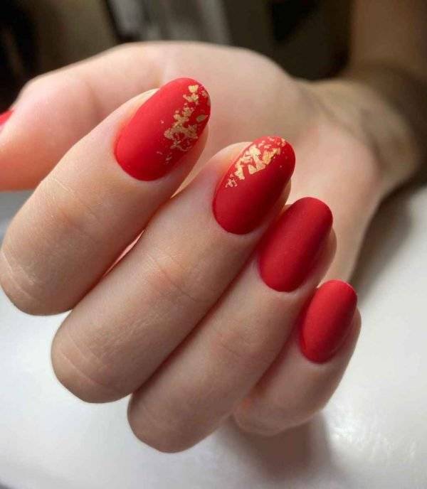 Невероятно выглядит красный маникюр с поталью. В качестве примера мы решили привести фотографию, на которой ноготки имеют красное матовое покрытие. Чтобы не переусердствовать, поталь нанесли всего на два ногтя, и результат получился очень сдержанным и утонченным.