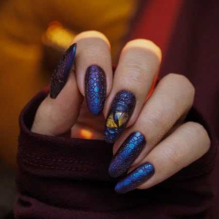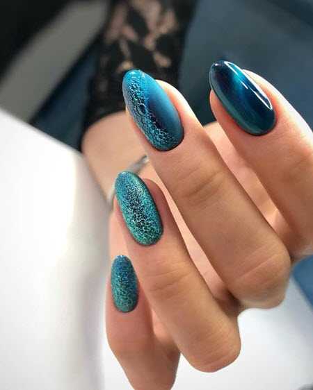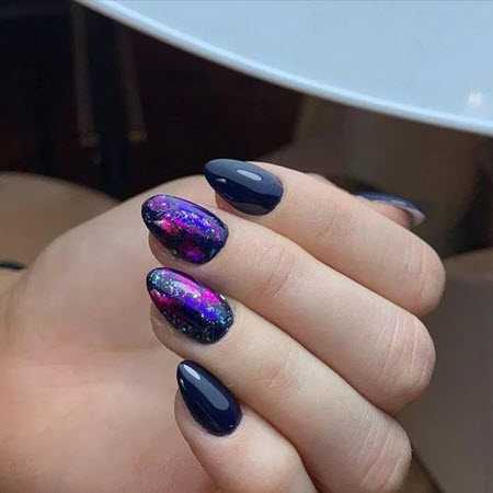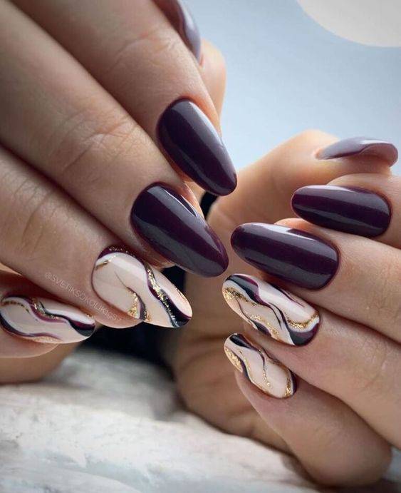Осенний маникюр 2020 года можно дополнить пенным дизайном ногтей в топовых цветах сезона: бордовый, синий, черный, фиолетовый.