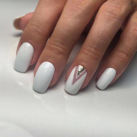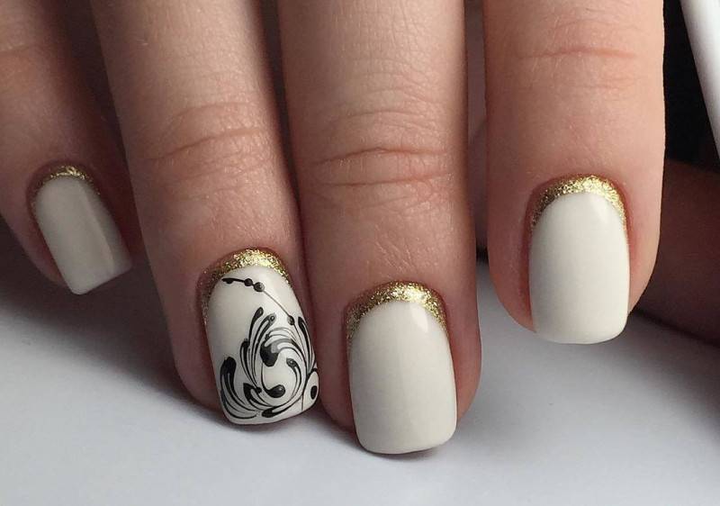 Классический белый цвет довольно часто используется в дизайне ногтей. Тем более, что вместе с золотым оттенком он выглядит особенно нежно и женственно. Такой маникюр может быть изумительным решением для романтического образа. Френч, легкие геометрические и абстрактные мотивы в золотистом цвете встречаются наиболее часто вместе с белым покрытием.