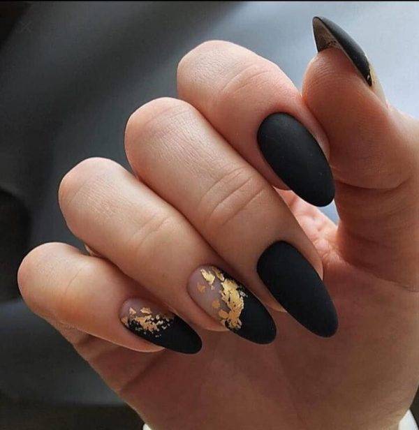 На каждый день можно рассмотреть вариант матового покрытия – здесь уместно будет смотреться матовая черная база, а два или три ноготка можно покрыть золотистым лаком.