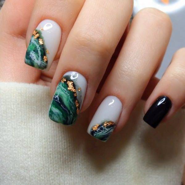 Хочется чего-то завораживающего и магического? Взгляните на представленный дизайн ногтей – он точно не оставит вас равнодушной. Покрытие на ногтях – это комбинация однотонного молочного цвета и текстурного рисунка в зеленом оттенке. Граница между ними выделена кусочками потали. Мизинец сделали независимым и нанесли на него черный лак.