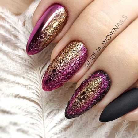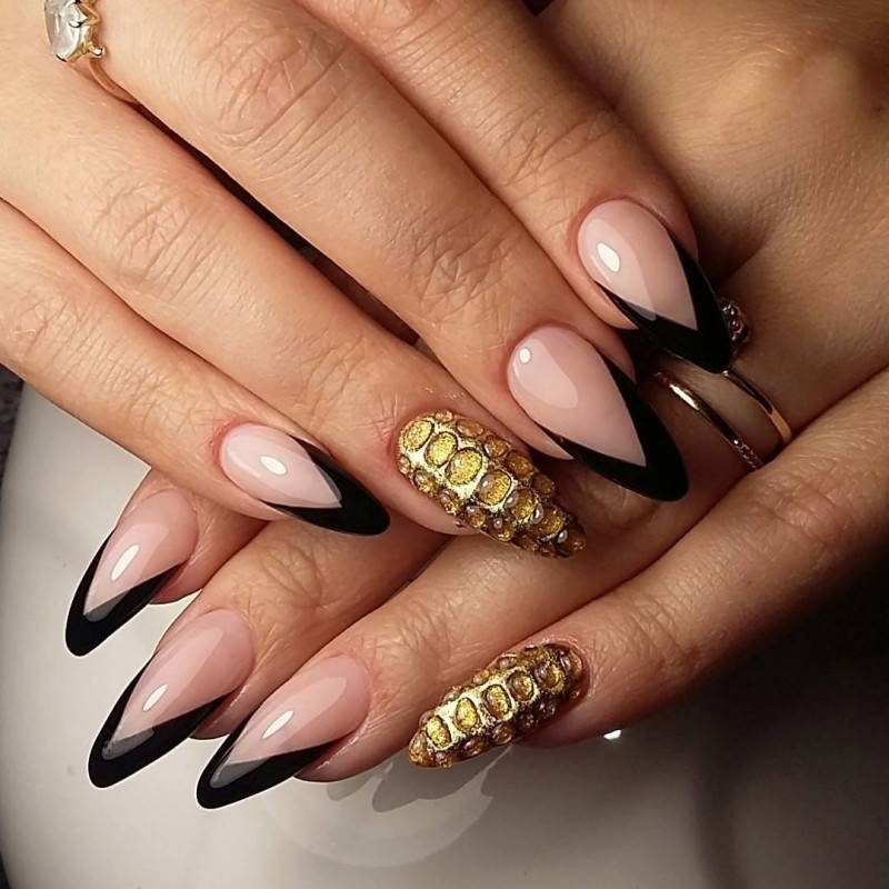 Не стоит забывать о том, что черный цвет прекрасно смотрится в качестве основы для дизайна. Его часто используют для оформления оригинального френча. Смотрится он достаточно необычно, поэтому золотые детали лишь украсят его. При желании можно сделать эффект крокодиловой кожи на нескольких ноготках. Он объемный, поэтому никогда не остается без внимания окружающих.