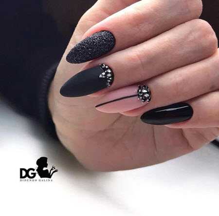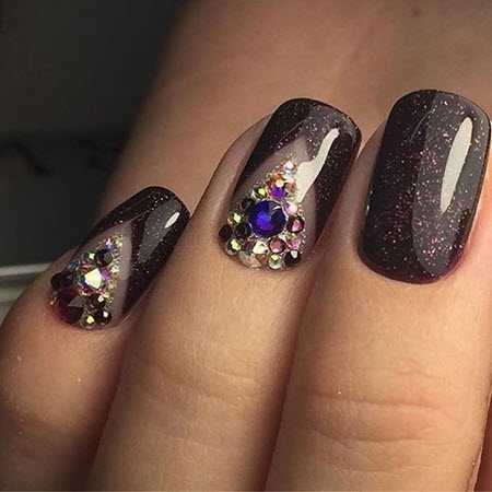 - для праздничного эффектного дизайна, к черному цвету подходят стразы, камни любого оттенка. Но классическим сочетанием считается использование серебристых страз.