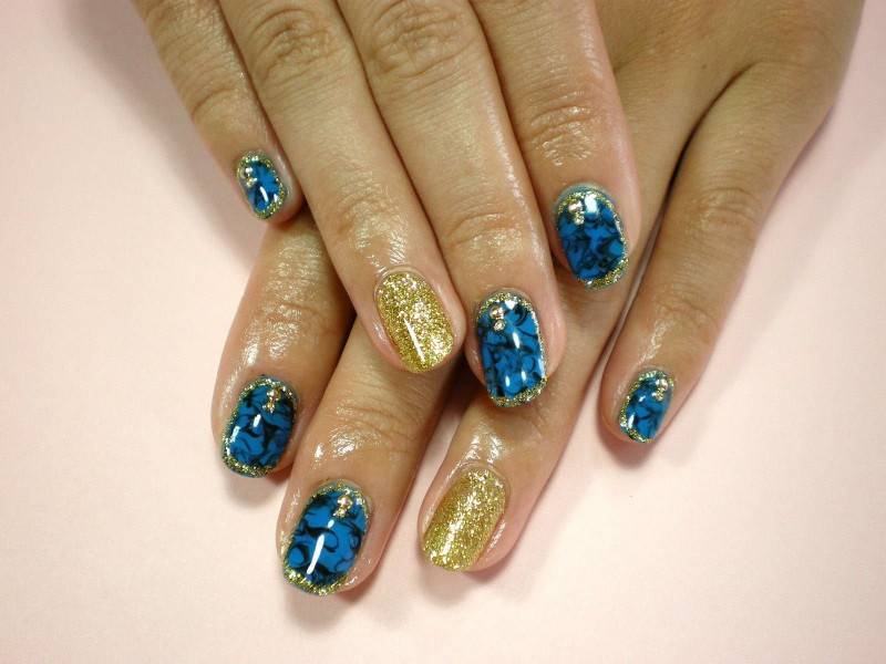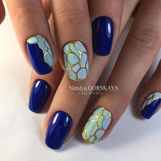 Синий цвет ногтей в сочетании с золотом создает яркий и стильный образ. Это сочетание идеально подойдет для летнего периода, а также для создания образа в стиле морских приключений.
