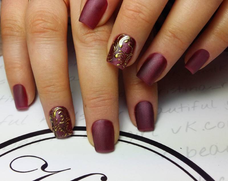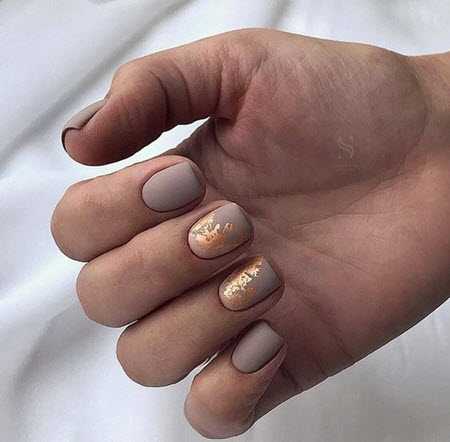 Этот вид маникюра многими недооценён. И совершенно напрасно. В отличие от глянцевого, матовый маникюр долго остаётся «нетронутым временем». Матовость приглушает цвет, но подчёркивает образ. В сочетании с золотом это даёт потрясающий эффект, поскольку строится он на лёгком контрасте.