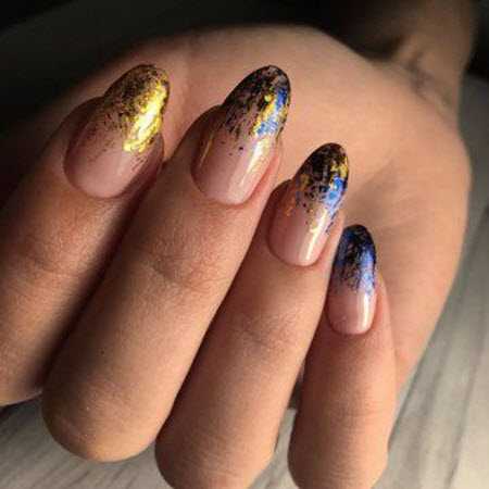 Техника популярна, поскольку часто выглядит выигрышно. Если нужен плавный переход, его можно посыпать блёстками, от этого эффект только усилится. Стиль же здесь зависит от плотности покрытия. Регулируется она всегда индивидуально. По цветам в приоритете контраст, но вполне допустимы пастельные оттенки.