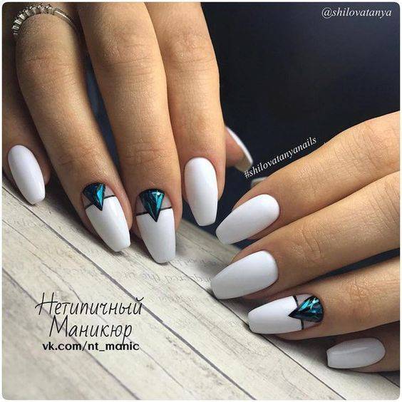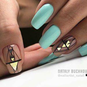 Если вы еще не испробовали маникюр с геометрическим дизайном на себе, то самое время сделать это сейчас. Для того чтобы создать собственный неповторимый, красивый и оригинальный шедевр, используйте разные виды трафаретов, штампов, липкие ленты или обыкновенный скотч: Как наносить штамп на ногти. В сочетании с геометрическими рисунками также отлично смотрятся стразы, цветной песок и камифубуки (блестящее конфетти для дизайна ногтей) Как рисовать вензеля на ногтях.