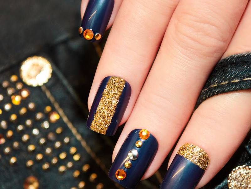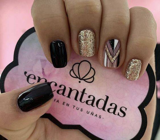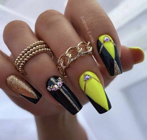 Декорирование привносит новые яркие краски в маникюр. В чёрно-золотом маникюре основным цветом используют чёрный, который выгодно будет оттенять золотые украшения. Выгодно смотрятся золотые полоски, которые сделают дизайн более абстрактным и добавят утончённости и чёткости. Одним из самых интересных решений будет сделать утончённую золотую линию по середине ногтя в обрамлении чёрных полосок. Блёстки и стразы – неотразимый, однако довольно непрактичный вариант, который больше подходит для особенных мероприятий. Придерживаясь общих линий стиля и задуманного дизайна, блестящий декор поможет создать шикарный праздничный маникюр.