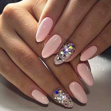 Мода на стразы возвращается. Но теперь ими просто обрамляют контур. Отдельно стразы практически не используют, а дополняют блёстками. Как вариант — безымянный и указательный палец густо посыпают блёстками, а на остальных только обрамляют стразами край.
