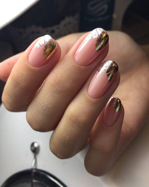 Следующий пример показывает, как можно сделать необычный и очень красивый френч. Все ногтевые пластины покрыты бледно-розовым лаком. На кончиках всех ноготков расположили поталь золотистого цвета